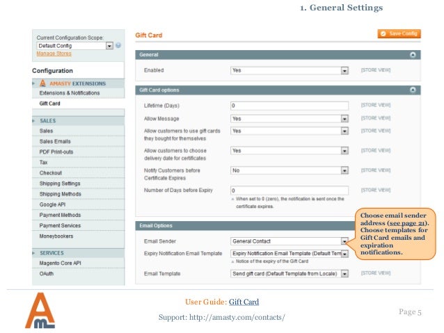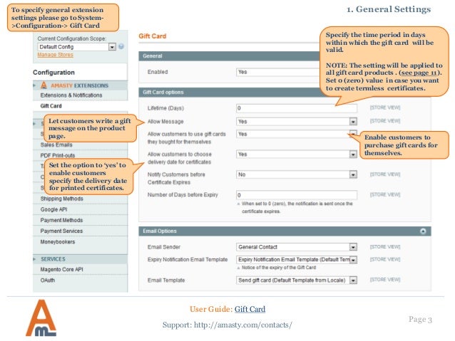 PDF Gift Card Magento Extension by Amasty | User Guide To specify general extension settings please go to System- >Configuration-> Gift Card User Guide: Gift Card Enable customers to purchase gift cards for themselves. Set the option to 'yes' to enable customers specify the delivery date for printed certificates. Page 4 1. General Settings Specify when the expiration notification should be sent.